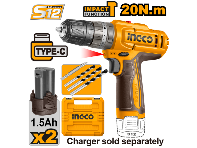 TALADRO ATORN. C/ PERCUTOR A BATERIA 12V 20NM C/ 2 BAT 1.5AH + MECHAS + VALIJA S/CARGADOR INGCO CIDLI122064