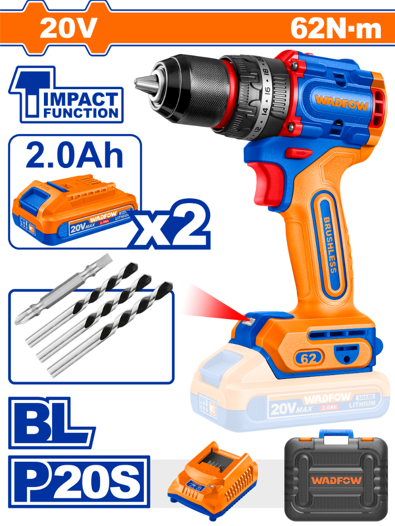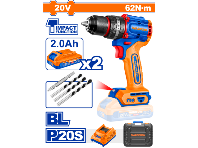 TALADRO ATORN. C/ PERCUTOR A BATERÍA 20V P20S BRUSHLESS C/2BAT, CARGADOR, ACCESORIOS Y VALIJA