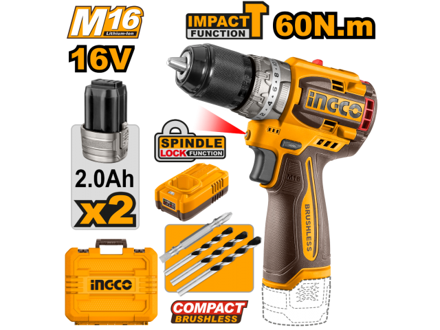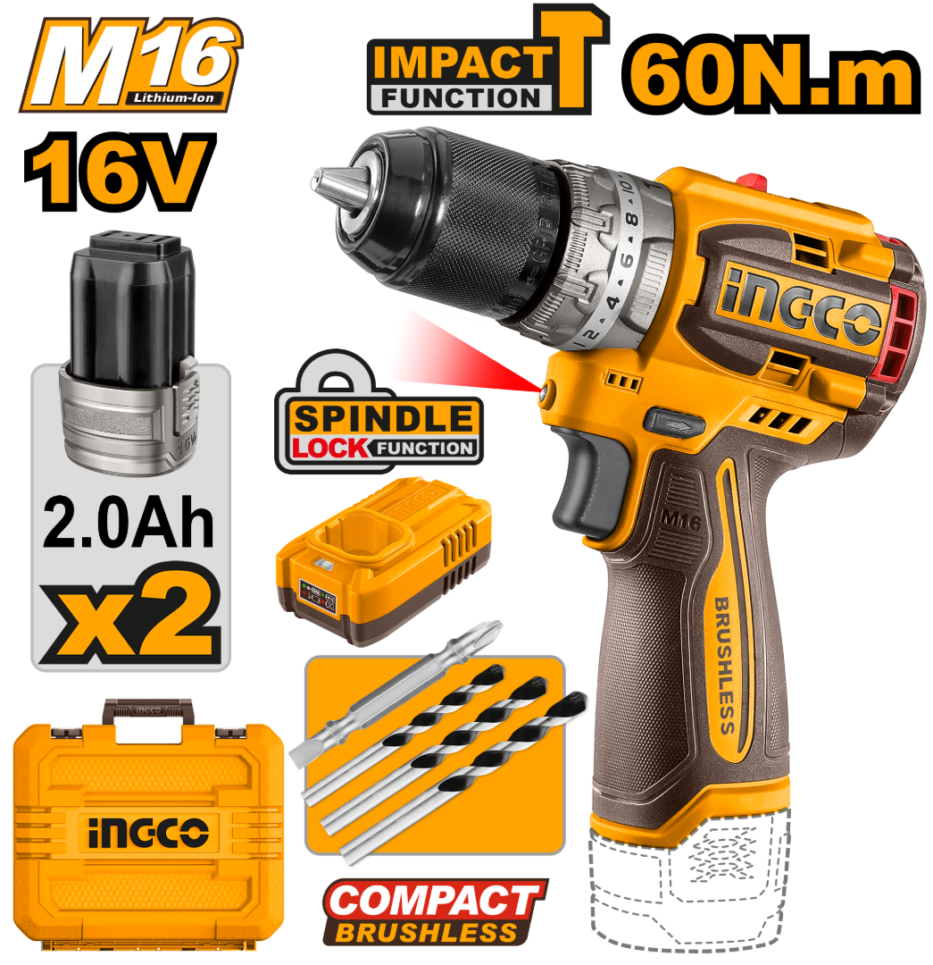 TALADRO ATORNILLADOR C/PERCUTOR 16V M16 60Nm 2.0AH BRUSHLESS MOTOR C/2 BATERÍAS + CARGADOR + PUNTAS + VALIJA INGCO CIDLI