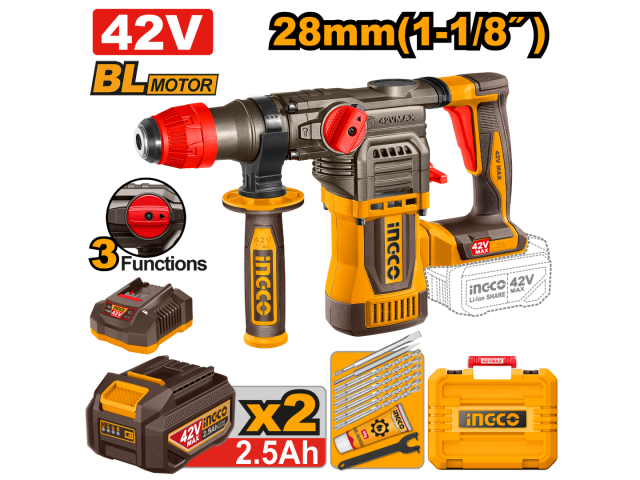 ROTOMARTILLO A BATERIA 42V 28MM 1-1/8" BRUSHLESS SDS PLUS 4.5J C/ 2 BAT 2.5AH + CARGADOR + ACCESORIOS + VALIJA INGCO CRHLI422882
