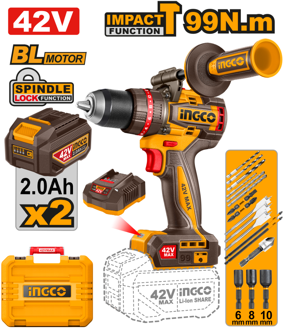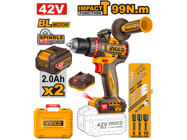 TALADRO ATORN. C/PERCUTOR A BATERIA 42V 99NM BRUSHLESS C/2 BAT 2.0AH + CARGADOR + ACCESORIOS + VALIJA INGCO CIDLI429982