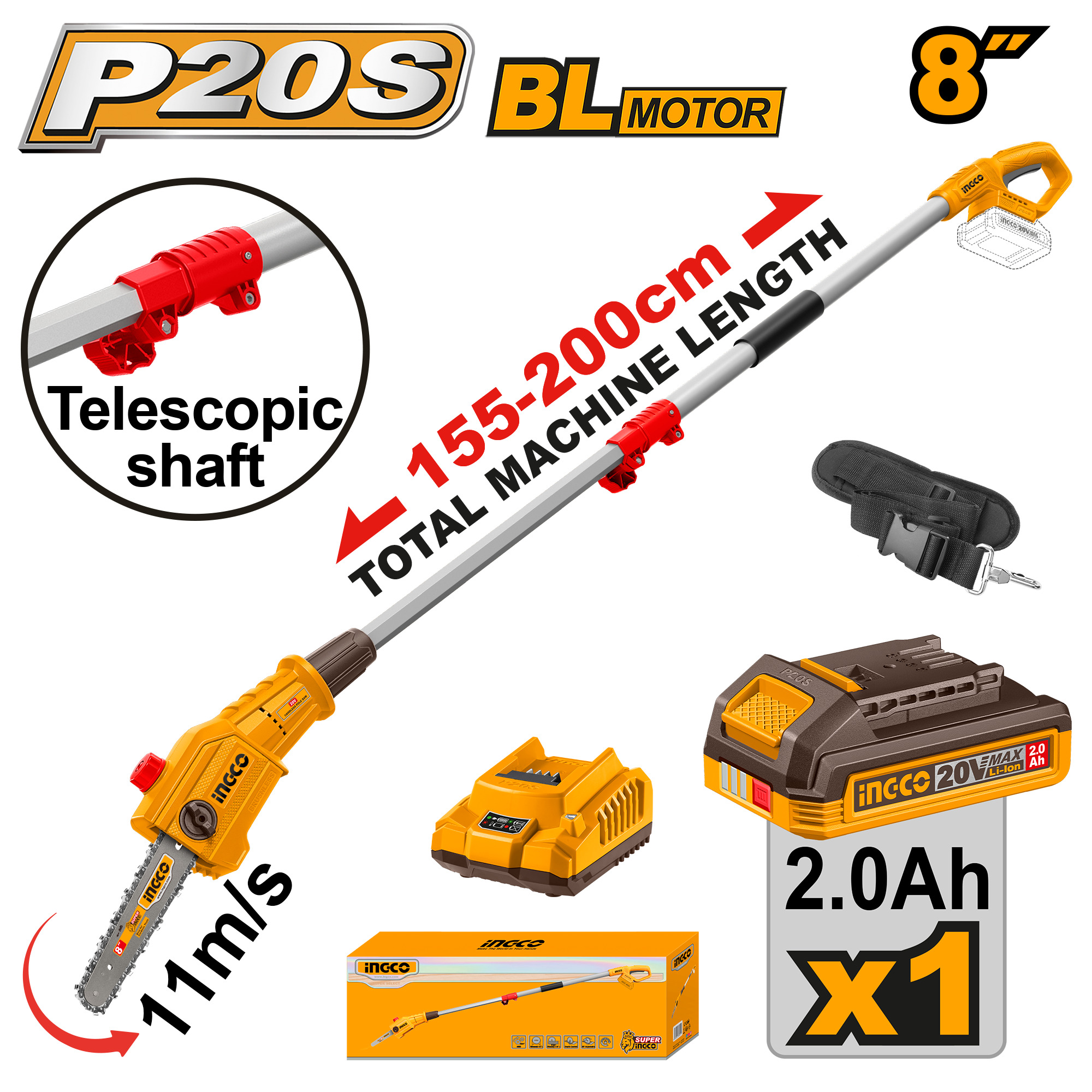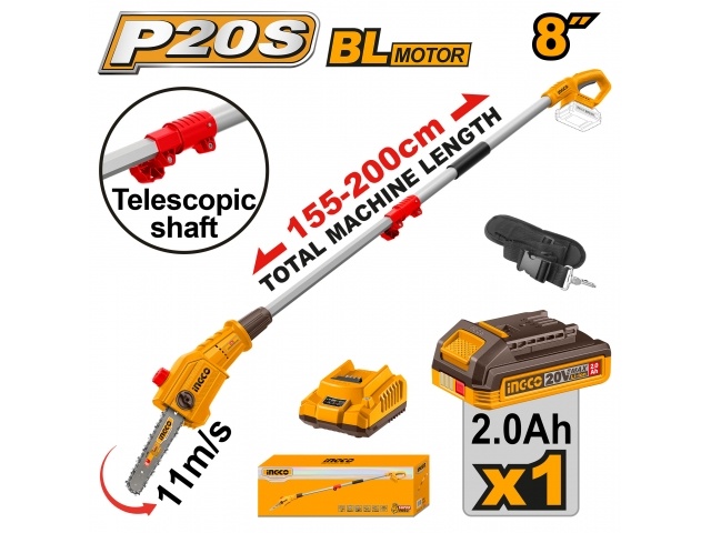 MOTOSIERRA DE ALTURA A BATERIA 20V 8" CON BATERIA 2.0AH + CARGADOR + ACCESORIOS INGCO PSLI20281