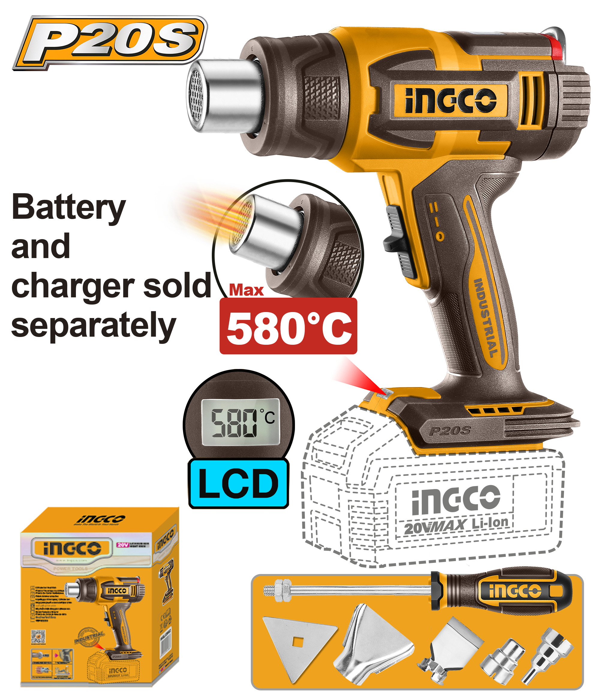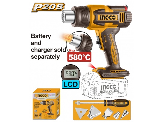 PISTOLA DE CALOR A BATERIA 20V 580°C CON ACCESORIOS SIN BATERIA SIN CARGADOR INGCO HGLI2058